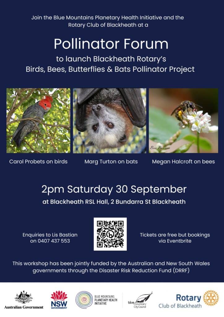 Pollinator Forum to launch Blackheath Rotary’s Birds, Bees, Butterflies and Bats Pollinator Project. Rotary will be working with local Men’s Sheds to produce nesting boxes and distributing seeds and information for planting habitat for our critically important pollinators.